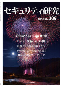 8月号(no.309) 「希薄な人権意識の代償」By 事務局 / 2024/07/25 no.309cover 月刊セキュリティ研究®309号を発行しました。8月号(309)の主な寄稿は、次の通りです。 希薄な人権意識の代償 (仲野 凛) / ロボット技術の軍事利用 (久保田ようじ) / 映像データ解析技術入門③ (セキュリティ人財養成センター) / データセンターの安全対策② (セキュリティ人財養成センター) / SECURITY Info. 有力企業15 社 他 会員限定 eBOOK